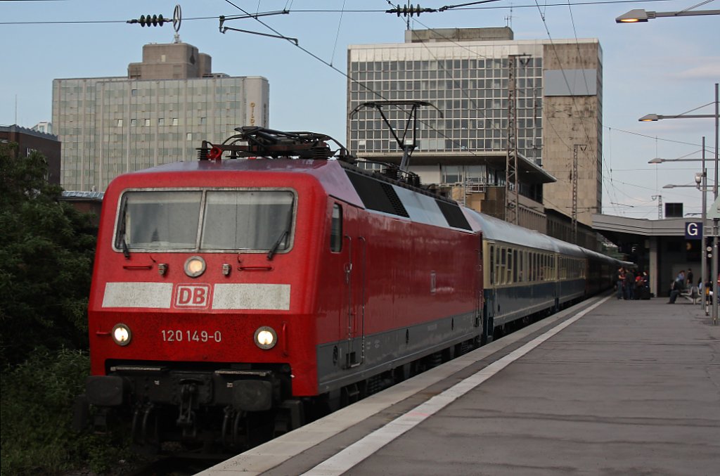 120 149 am 20.5.12 mit dem IC 2417 bei der Abfahrt in Essen Hbf.