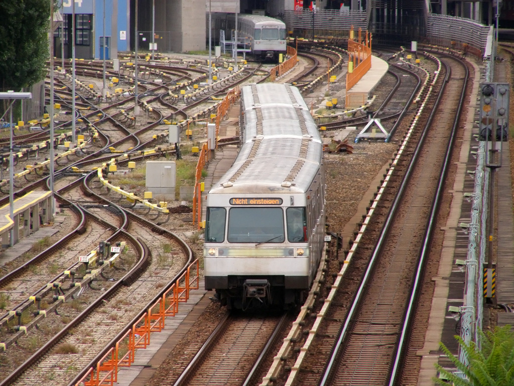 Aussicht: bei den DT3-Triebwagen der Hamburger U-Bahn gibt eine kaum getönte Scheibe zwischen Fahrerkabine und Fahrgastraum den Blick frei auf die Strecke - hier bei der Einfahrt in den Bahnhof "Kellinghusenstraße". 29.5.2011