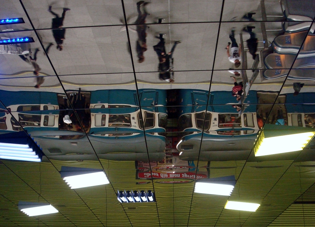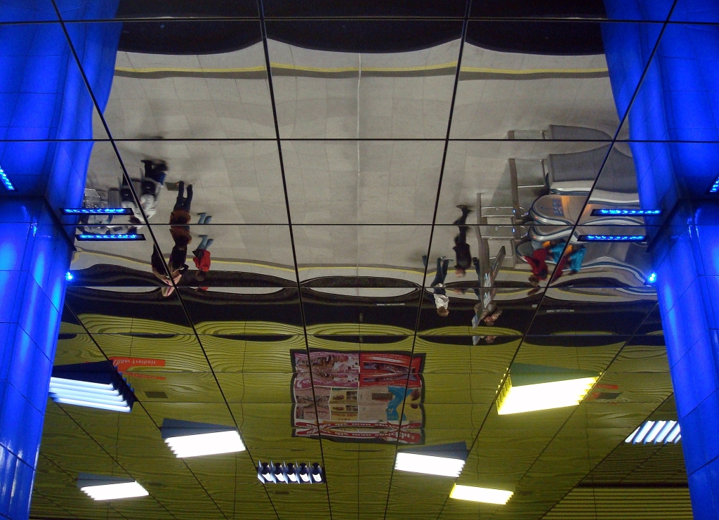 Verkehrte Welt: Spiegeldecke im U-Bahnhof "Münchner Freiheit". 2.5.2011