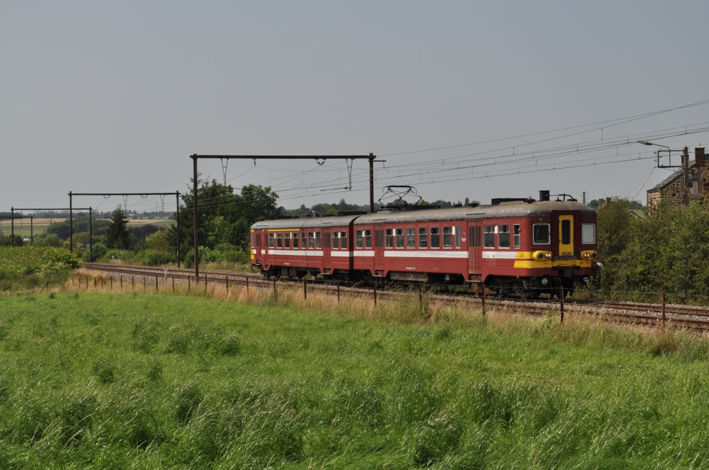 8270 und 8228 stehen nach der Bedienung der Kalkwerke von Marche-les-Dames mit dem fertigen Zug zu den Brennöfen nach Nameche an der Ausfahrt, und warten noch auf die Kreuzung mit einem Break. Aufgenommen am 28.06.2012