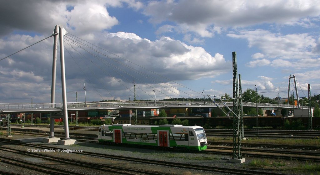 Die EIB mit VT 650 bei der Einfahrt nach Hof Hbf pasiert gerade den neuen Luftsteg, das hofer "Golden Gate". Aufgenommen am 8. August 2012.