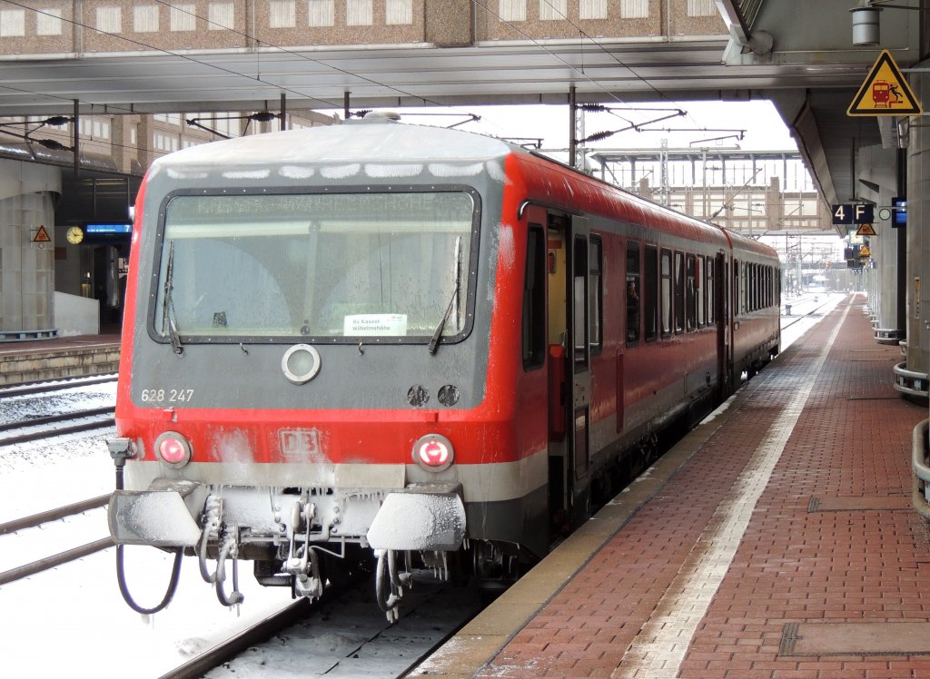 Gerade eingetroffen am Zielort Kassel-Wilhelmshöhe und gezeichnet von der Jahreszeit, Triebwagen 628 247.