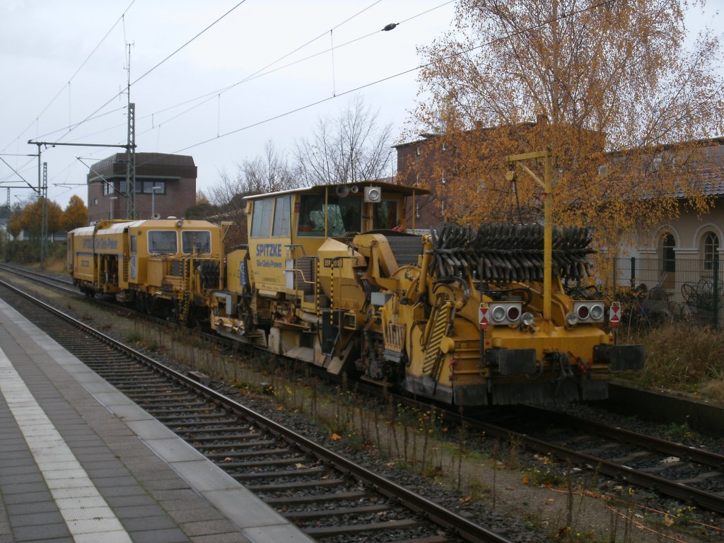 Vom Bahnsteig in Itzehoe konnte ich,am 18.November 2012,die Schotterplaniermaschine SSP110 SW und die Gleisstopfmaschine Umimat 3S fotografieren.