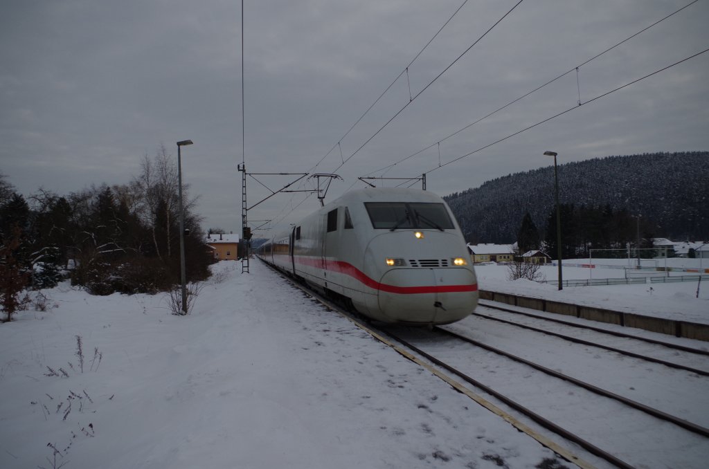 Ein ICE-T durchfährt am 14.12.2012 die Haltestelle Gundelsdorf mit ca. 25 min Verspätung.