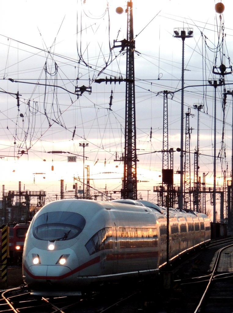 Kurz vor Eintritt der abendlichen Dunkelheit erreicht dieser ICE 3 den Frankfurter Hauptbahnhof (15.12.2012).