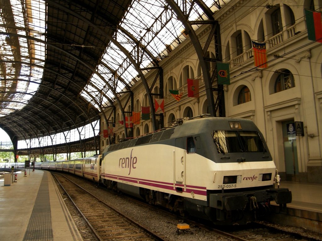 Renfe 252 057-5 mit einem internationalen Zug am Bahnhof Franca in Barcelona (Estacio de Franca), am 05. 05. 2012.