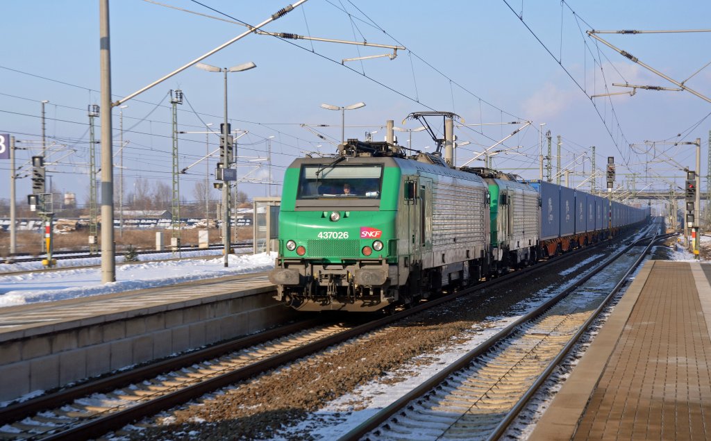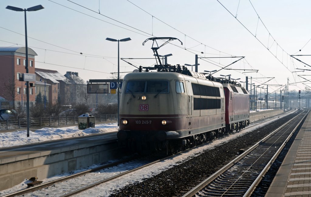103 245 wurde am 05.02.12 von München nach Dessau ins dortige Aw überführt, im Schlepp hatte sie 120 144. Fotografiert bei der Durchfahrt in Bitterfeld.