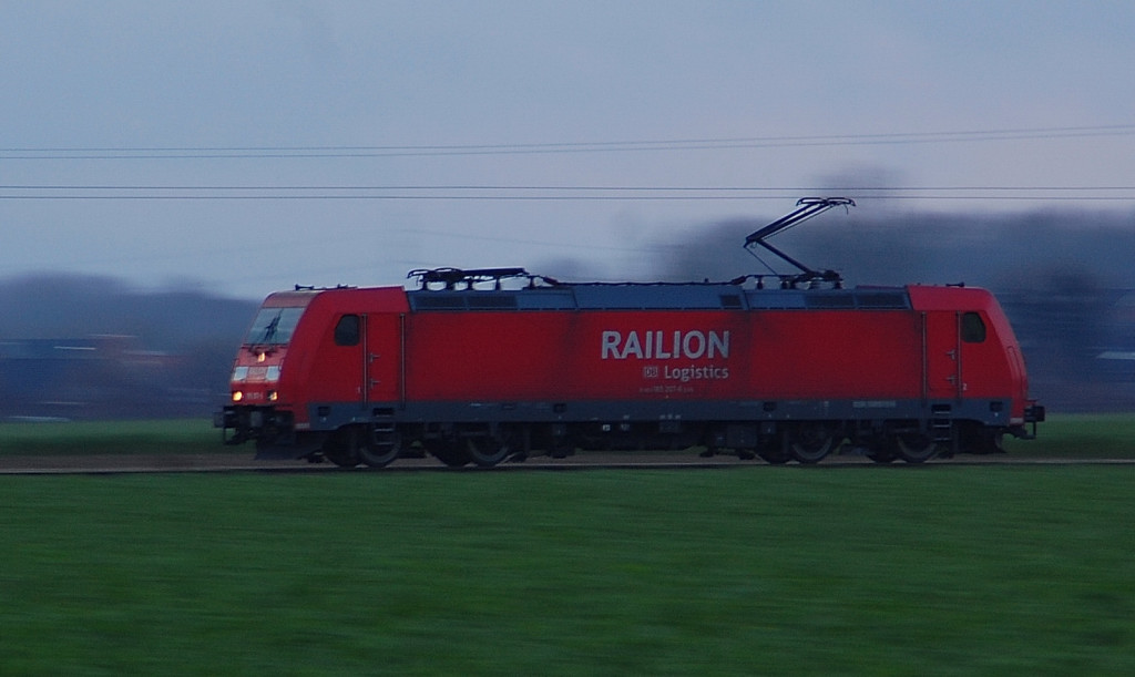 Am späten Abend des 30.12.2011 fotografierte ich die 185 207-4 solo bei Nievenheim und dieses lustige  Foto  kam dabei heraus....ich war wohl einige hundert Meter von der Strecke entfernt...sehr kurios.