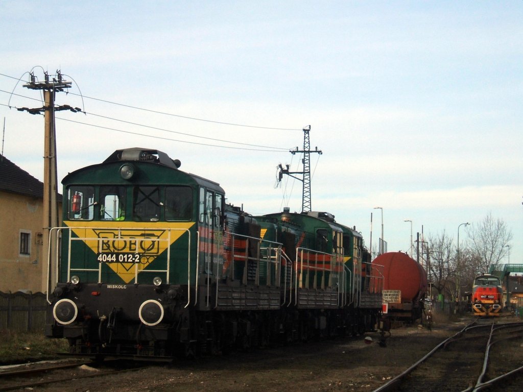 Bobo Kft. 4044 012, 4044 010, 4044 011 (früher alle drei: Baureihe A25) und MÁV-Trakció M47 1322 stehen in Komárom, am 27. 02. 2010.