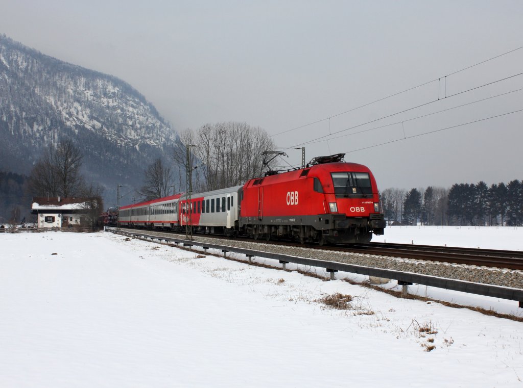 Die 1116 057 mit einem Autoreisezug am 04.02.2012 unterwegs bei Niederaudorf.