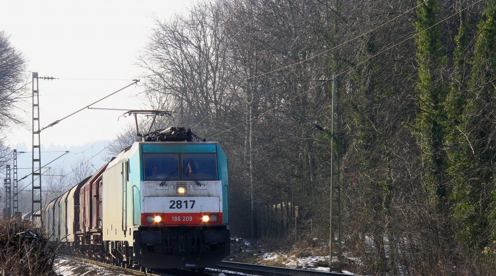Die Cobra 2817 kommt bei Schnee mit einem gemischten Güterzug aus Belgien die Rampe runter gerauscht in Richtung Aachen-West bei Schnee. Aufgenommen am Gemmenicher-Weg am 10.2.2012.