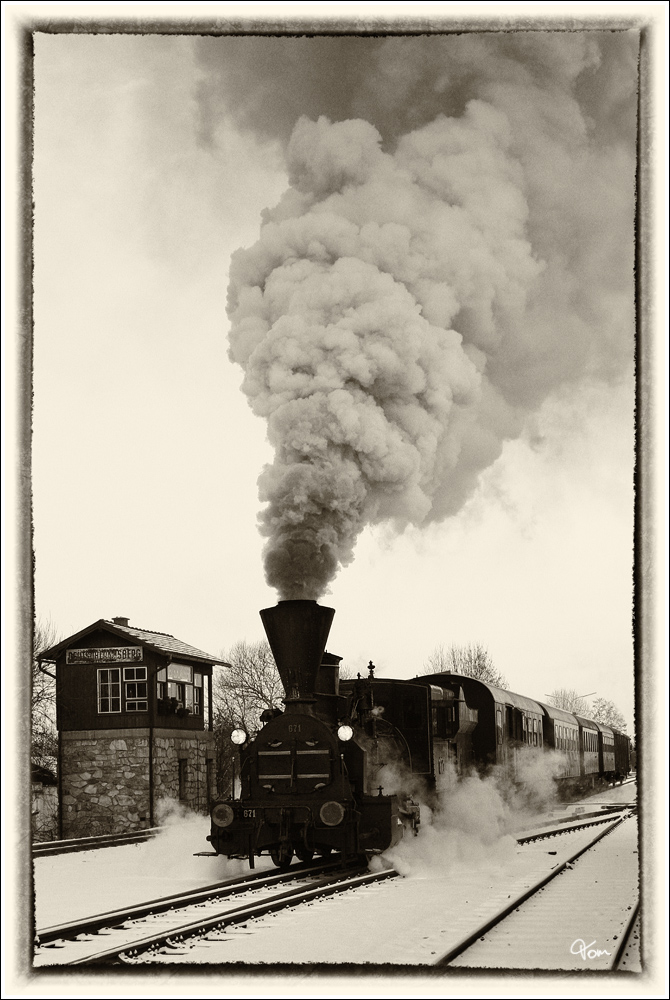 Für eine kleine Gruppe aus England gab es dieser Tage Winterdampf in der Steiermark. Hier sieht man die dienstälteste Dampflok der Welt, die 671 der Gkb mit dem SPZ 8519 auf der Fahrt von Graz Köflacherbahnhof nach Wies Eibiswald. Krottendorf 5.2.2012