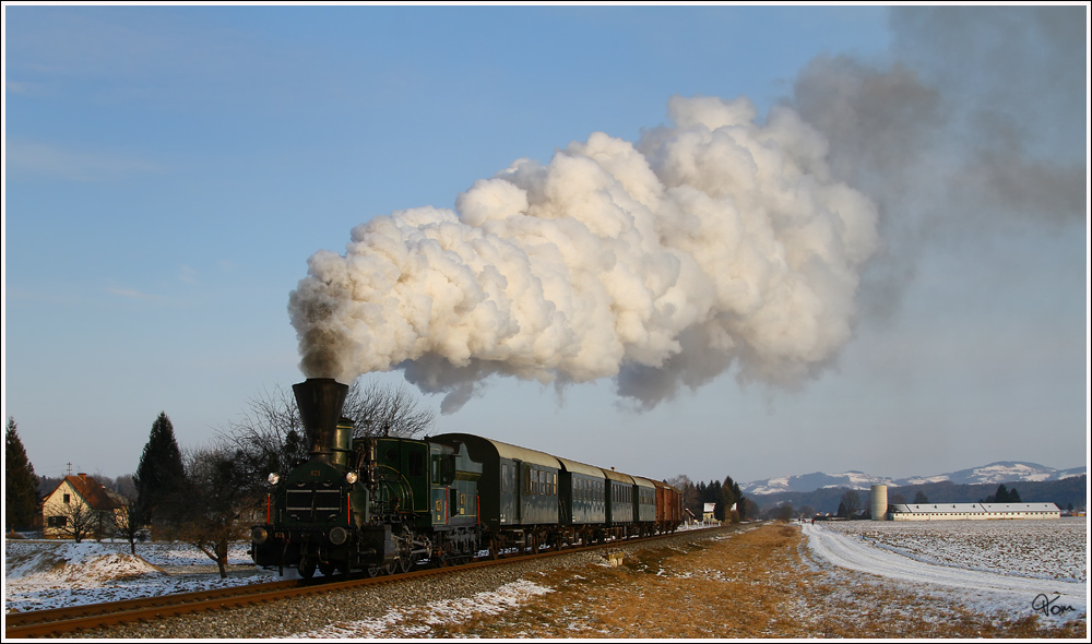 Für eine kleine Gruppe aus England gab es dieser Tage Winterdampf in der Steiermark. Hier sieht man die dienstälteste Dampflok der Welt, die 671 der Gkb mit dem SPZ 8519 auf der Fahrt von Graz Köflacherbahnhof nach Wies Eibiswald. Deutschlandsberg 5.2.2012