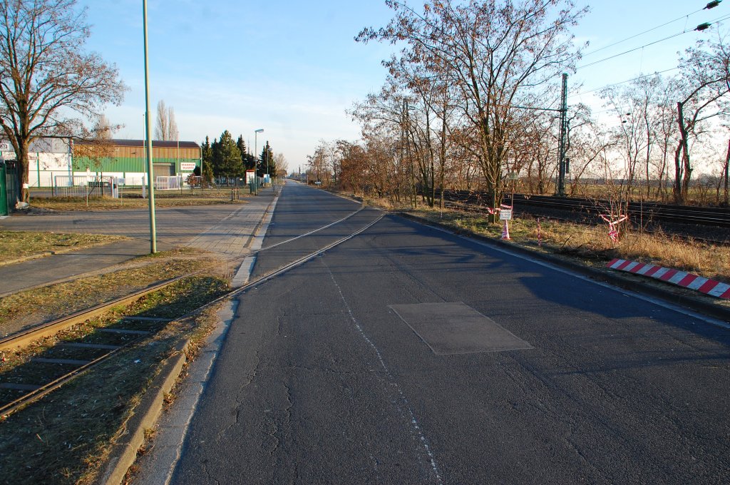 Im Bahnhof Norf an der Südausfahrt waren einige Betriebe angeschlossen...so kreuzt dieses Zufahrtsgleis in ein ehemaliges Speditonsgelände die Mainstrasse. 5.2.2012