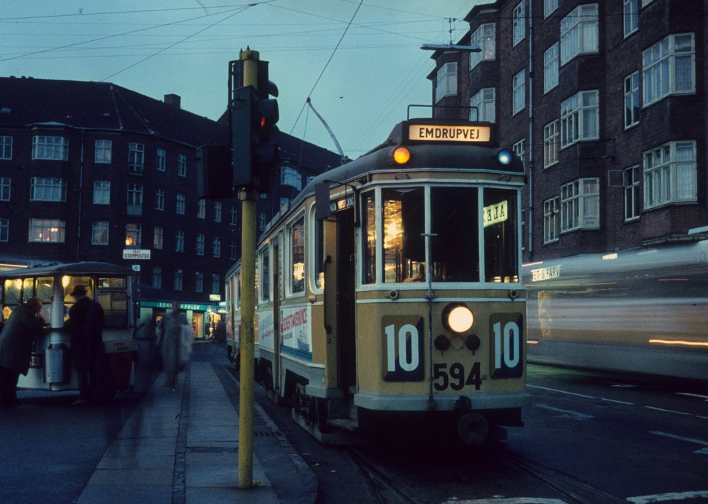 København / Kopenhagen Københavns Sporveje (KS) SL 10 (Tw 594 + Bw 15**) Valby, Toftegårds Plads (Endstelle) im Oktober 1968. - Scan eines Diapositivs,