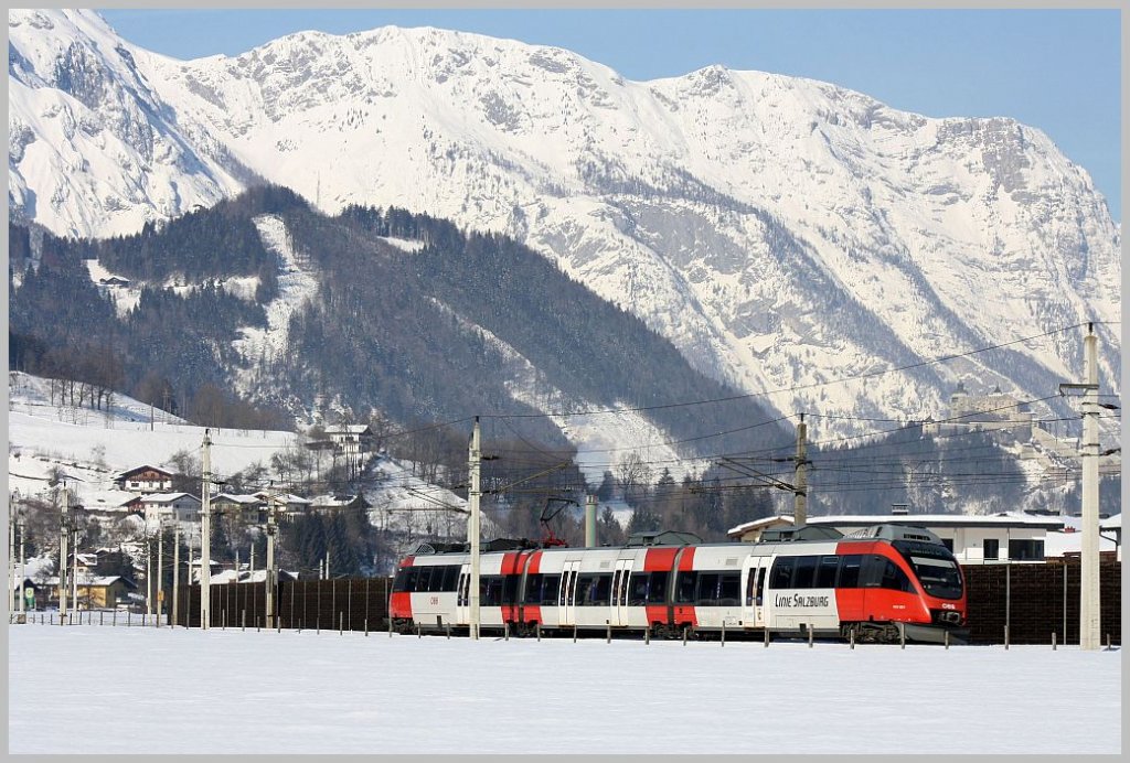 Teleaufnahme vom  Baby Talent  4023 002, unterwegs nach Schwarzach-St. Veit. Im Hintergrund ist die Festung Hohenwerfen zu erkennen. Pfarrwerfen, 30.01.12