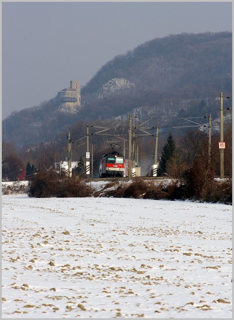 1144 017 mit R 2168 am 8. Februar 2012 bei der Durchfahrt in Greifenstein. Zu dieser Jahreszeit ist von dieser Stelle aus auch die Burg Greifenstein etwas zu sehen.