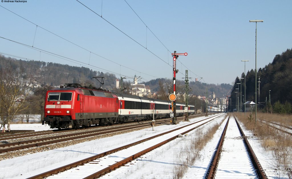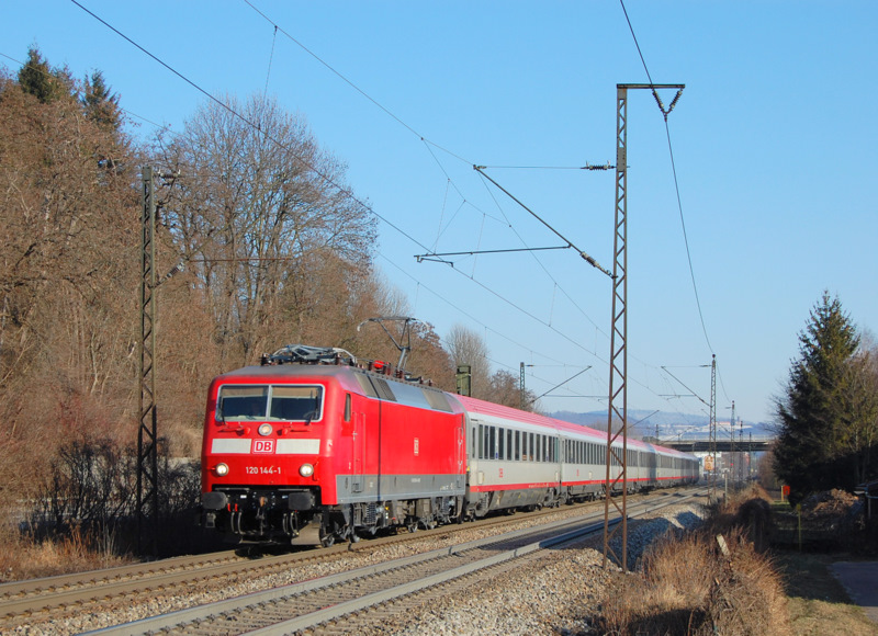 Anstatt der erwarteten 103 bespannte am 03.02.2012 die 120 144-1 den IC 118. Mit einer guten halben Stunde Verspätung passierte der elegant wirkende Zug meine Fotostelle bei Göppingen.