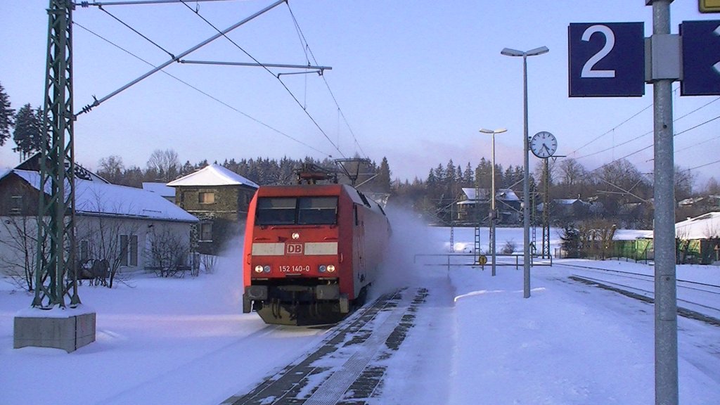 Schon länger nicht gesehen: 152 005-5 mit Containerzug in Fahrtrichtung Süden. Aufgenommen am 08.02.2012 in Eschwege West.