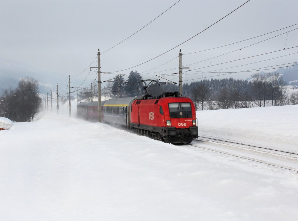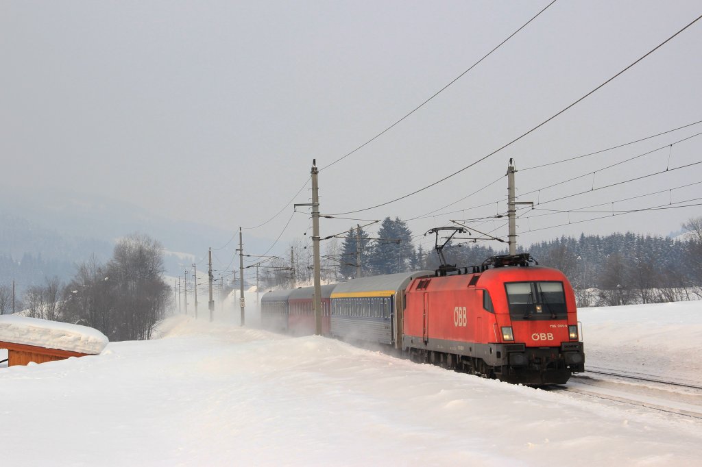 ÖBB 1116 095-6 mit dem kürzesten Turnuszug des Tages bei Fieberbrunn am 11.02.12.