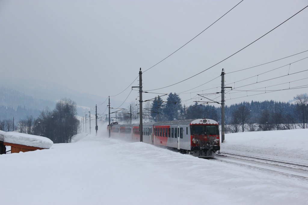 Eine ÖBB City-Shuttle Garnitur geschoben von einer 1144 aufgenommen am 11.02.12 bei Fieberbrunn.