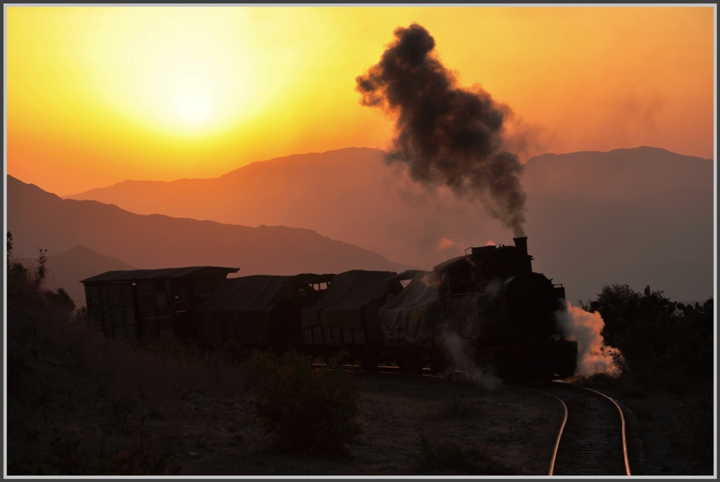 Wie ein Scherenschnitt, Sonnenaufgang über den Geleisen der Eritreischen Eisenbahn. (31.01.2012)
