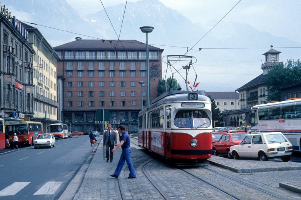 Innsbruck Innsbrucker Verkehrsbetriebe (IVB) SL 3 (Lohner-GT6 74) Südtiroler Platz / Hauptbahnhof am 14. Juli 1978. - Scan eines Diapositivs. Film: Kodak Ektachrome. Kamera: Leica CL.