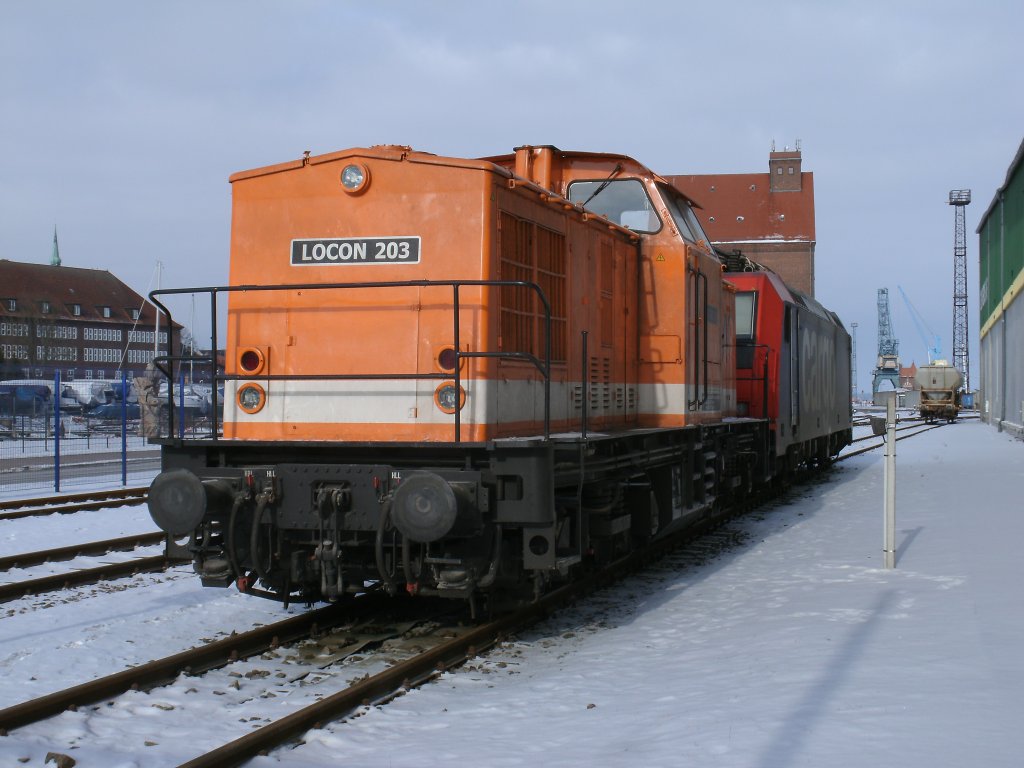 LOCON 203 und die Schweizer Re482 038,am 11.Februar 2012,im Stralsunder Nordhafen.Aufnahme durch den Zaun.