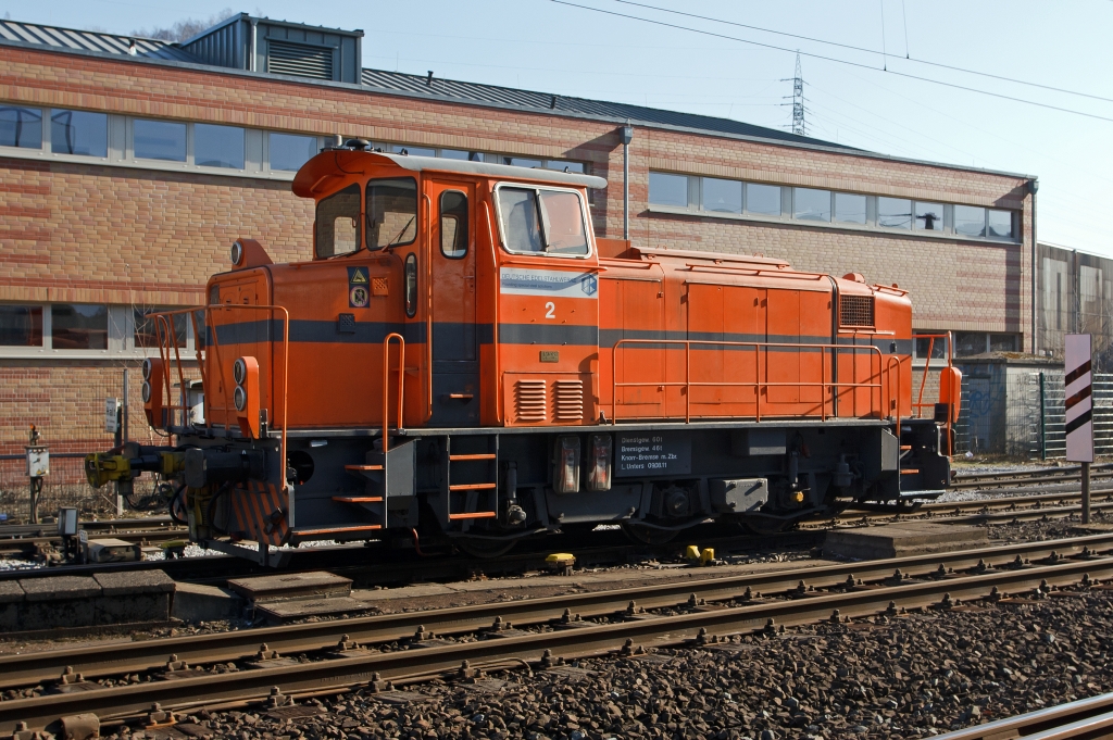 Lok 2 der Deutschen Edelstahlwerke (DEW), zuvor Edelstahlwerke Südwestfalen zieht beladene Wagen auf den Werksgleisen am 11.02.2012 in Siegen-Geisweid. Die Lok ist eine Mak G 500 C , Baujahr 1970, Fabr.-Nr. 500051 , Bauart C-dh.