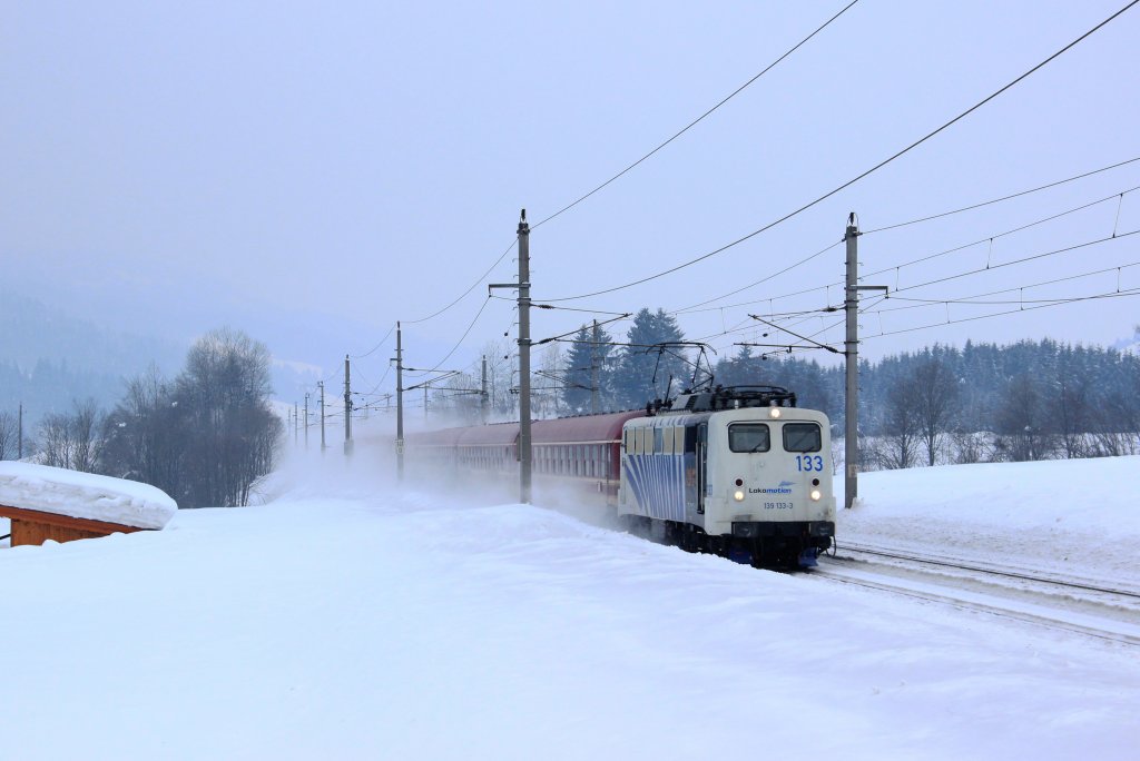 Lokomotion 139 133-3 "50 Jahre Zuverlässigkeit im Einsatz" zieht einen Turnuszug von Wörgl in Richtung Saalfelden. Aufgenommen am 11.02.12 in Fieberbrunn.