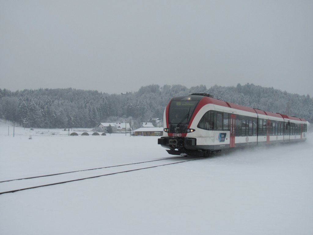 5063 008, der einzige GKB GTW im blauen S-Bahn Design, am 11.2.2012 als R 8570 (S61) von Wies-Eibiswald über Lieboch nach Graz im Oisnitzgraben kurz vor der Haltestelle Oisnitz-St. Josef aufgenommen.
