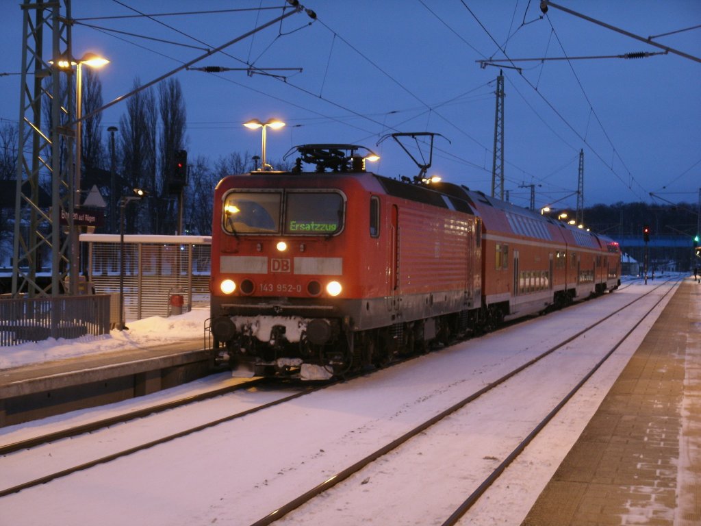 Und die nächste Lady war auf Rügen.Am 11.Februar 2012 war es 143 952 die mit dem RE 13014 Binz-Rostock,in der Blauen Stunde,in Bergen/Rügen hielt.
