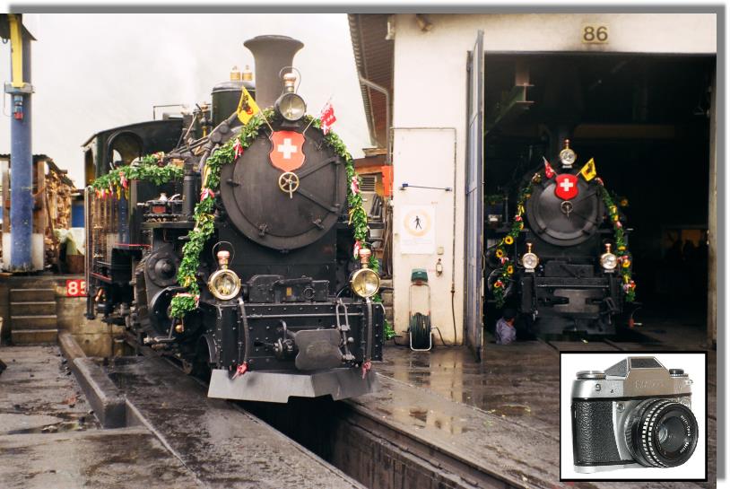 Vor dem Lokschuppen der DFB in Realp. Fotografiert im August 2010 mit einer Ihagee EXA 500 von 1967.