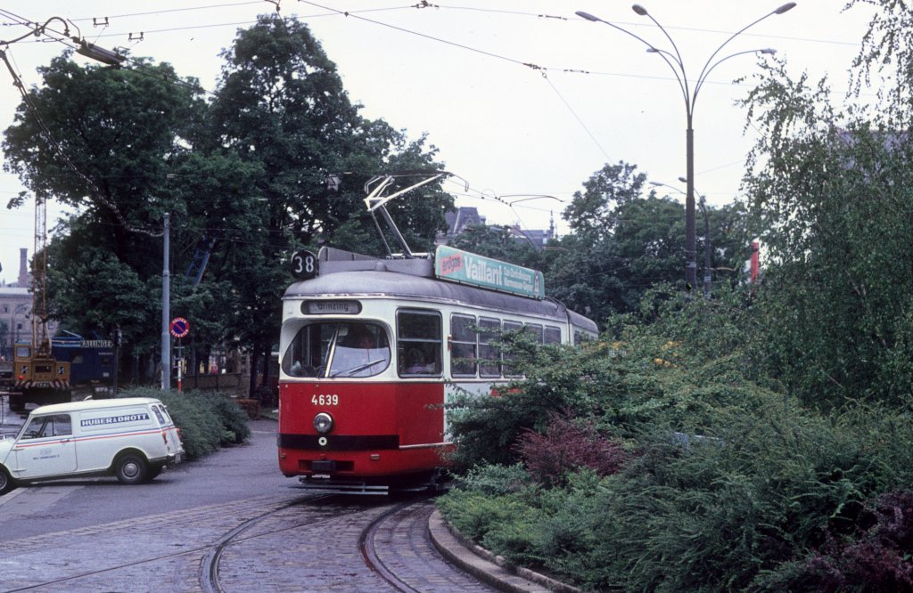 Wien Wiener Stadtwerke-Verkehrsbetriebe (WVB) SL 38 (E1 4639 (SGP 1966)) fährt am 18. Juli 1974 in die obere (ebenerdige) Schleife am Schottentor ein. - Scan eines Diapositivs. Film: AGFA CT 18. Kamera: Minolta SRT-101.