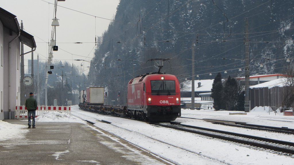 ÖBB 1144 211 und eine 1116 ziehen den SAE-KLV in Richtung Brenner. Geschoben wurde der Zug übrigens von der 1116 038-9. Brixlegg, 11.02.12