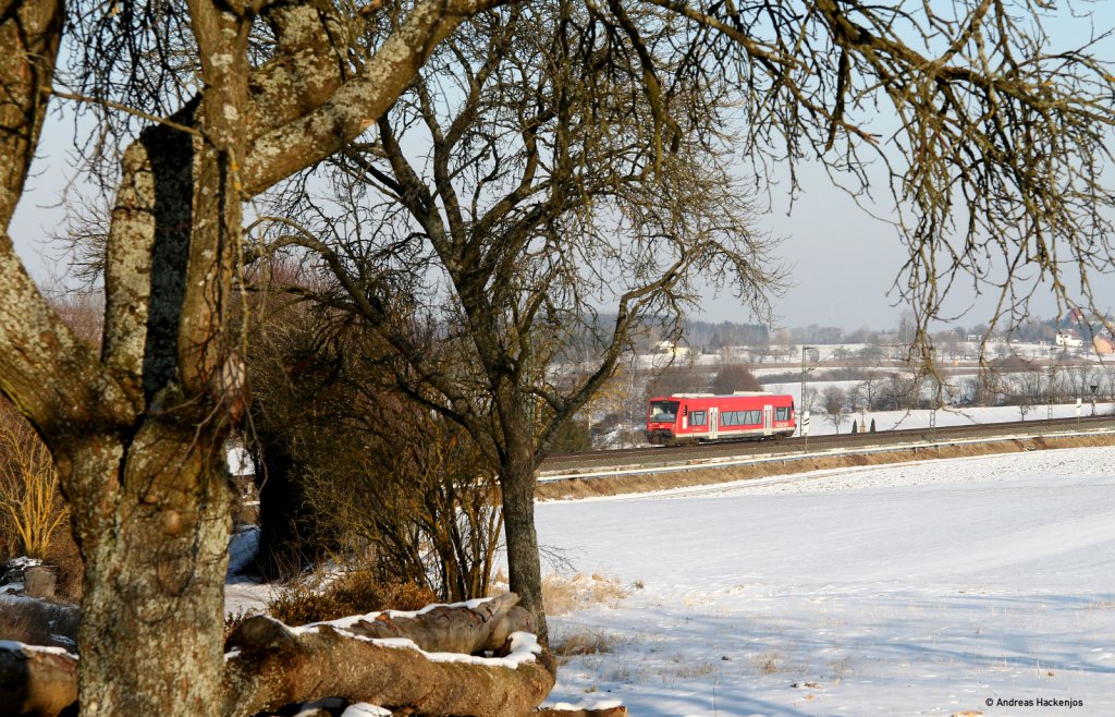 VT 747 der NWB auf seinem Weg nach Münster bei Beelen am 7.1.2012, nur zeigt er hier die rote Laterne;-)!!!!