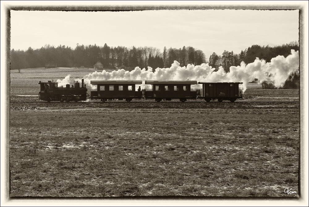 Für eine kleine Gruppe aus England gab es dieser Tage Winterdampf in der Steiermark. Hier sieht man die dienstälteste Dampflok der Welt, die 671 der Gkb mit dem SPZ 8447 auf der Fahrt von Graz Köflacherbahnhof nach Köflach. Lieboch 4.2.2012