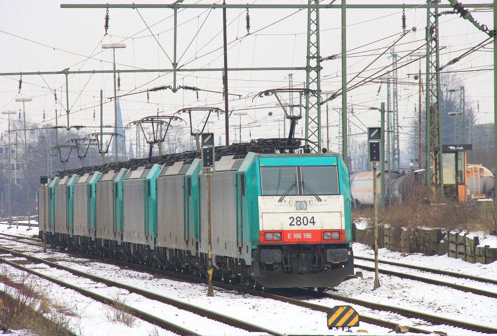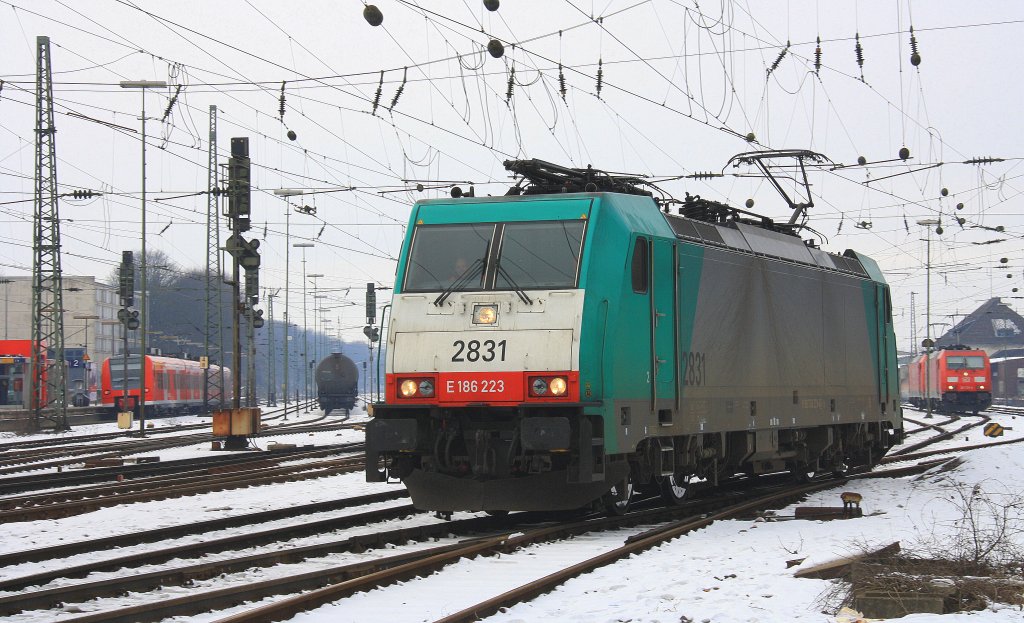 Cobra 186 219 (2827) fährt am 07.02.2012 mit zwei 185er und einem Stahlzug aus Belgien am Haken aus Aachen West nach Gremberg.