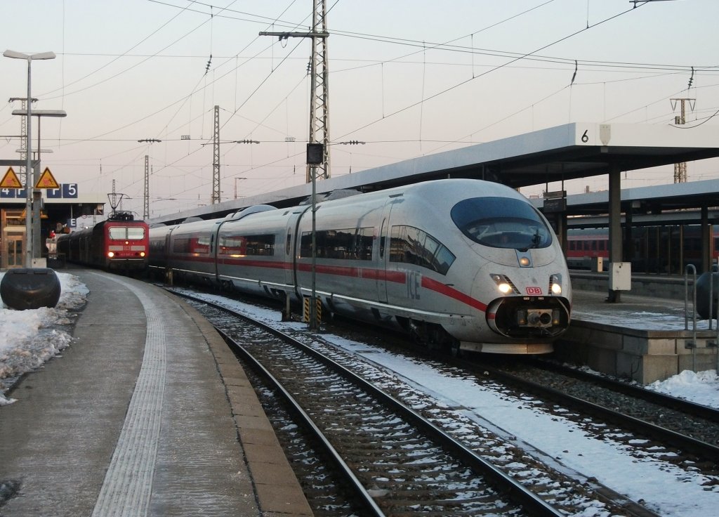 Hier links 112 123 mit einem RE1 von Berlin Charlottenburg nach Frankfurt(Oder) und rechts 401 060-9 "Mülheim(Ruhr)" als ICE279 von Berlin Ostbahnhof nach Interlaken Ost, diese beiden Züge begegneten sich am 30.1.2012 in Berlin Hbf.