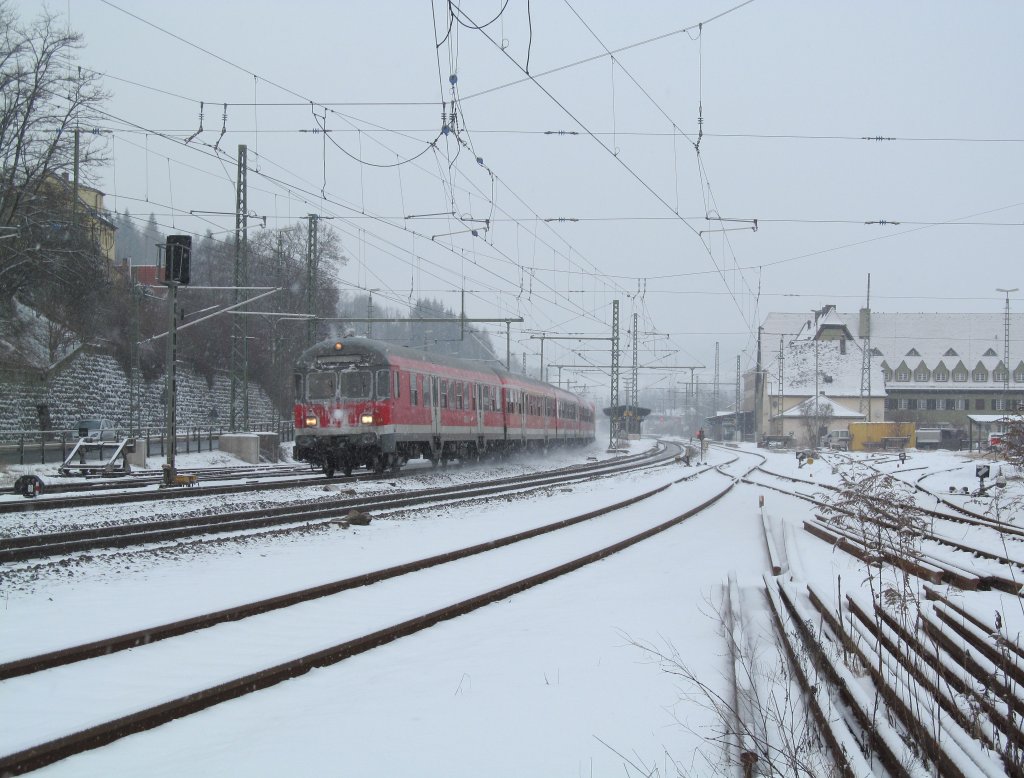 Eine Regionalbahn von Saalfeld nach Bamberg verlässt am 9. Februar 2012 den Kronacher Bahnhof. Am Zugschluss schiebt außerplanmäßig eine 143.
