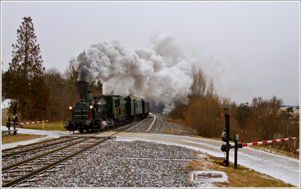 Für eine kleine Gruppe aus England gab es dieser Tage Winterdampf in der Steiermark. Hier sieht man die dienstälteste Dampflok der Welt, die 671 der Gkb mit dem SPZ 8447 auf der Fahrt von Graz Köflacherbahnhof nach Köflach.