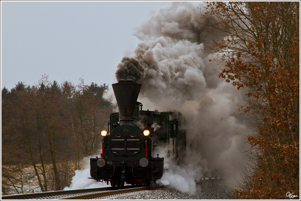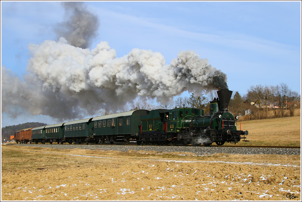 Für eine kleine Gruppe aus England gab es dieser Tage Winterdampf in der Steiermark. Hier sieht man die dienstälteste Dampflok der Welt, die 671 der Gkb mit dem SPZ 8519 auf der Fahrt von Graz Köflacherbahnhof nach Wies Eibiswald. Oisnitz 5.2.2012