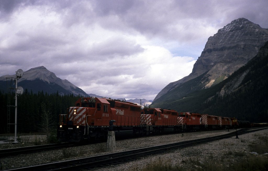 Im Banff National Park führt der Trans-Canada Highway teilweise an der Bahnlinie Calgary - Vancouver entlang. Am 08.10.1989 stehen an einer Ausweichstelle 6 Dieselloks der CP Rail mit ihrem Güterzug und warten auf einen Gegenzug.