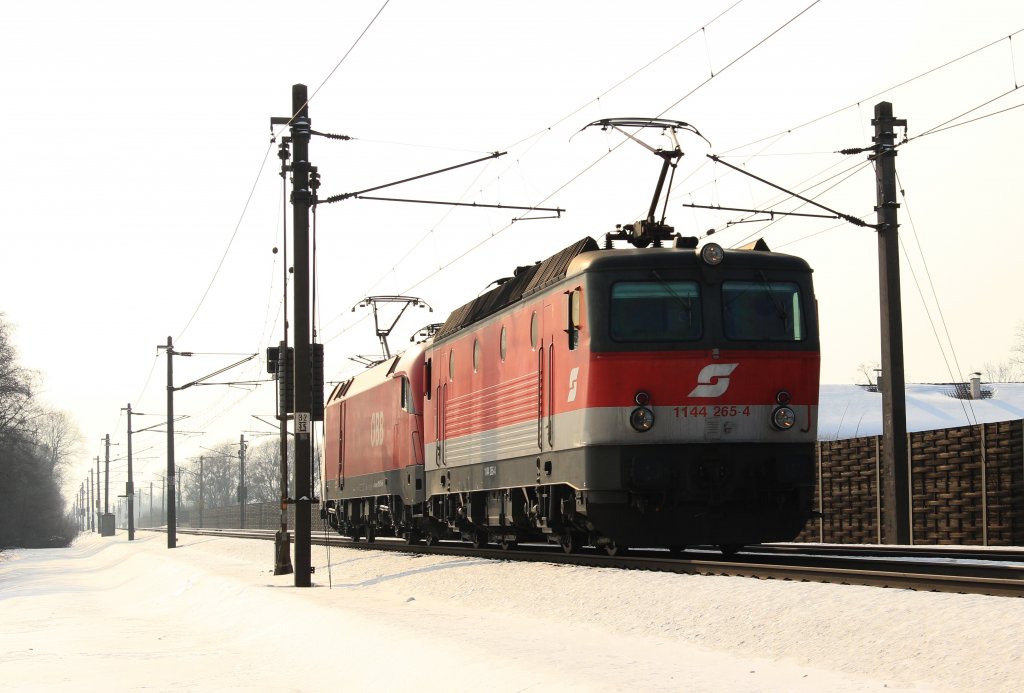 Die 1144 082 und die 1116 070 mit einem Güterzug am 11.02.2012 unterwegs bei Brixlegg.