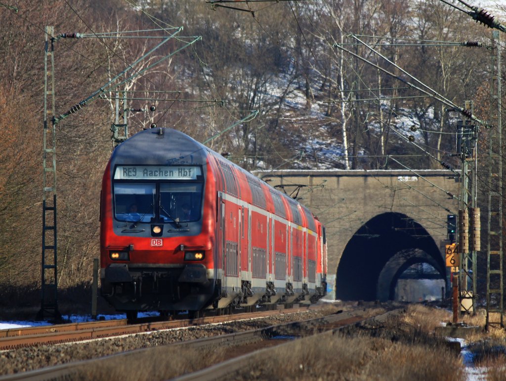 RE9 geschoben von 111 114 hat am 11.02.2012 Stolberg Hbf verlassen, den Nirmer (125 m) und den Eilendorfer Tunnel (357 m) durchfahren und fährt nun durch Eilendorf zum nächsten Halt Aachen Rothe Erde.