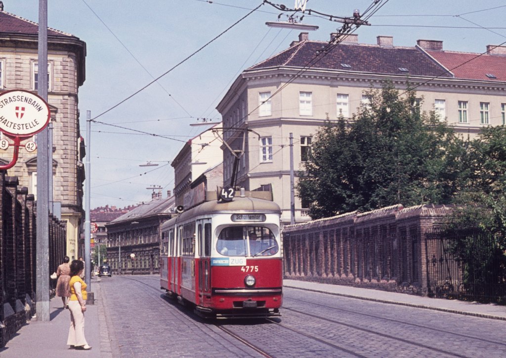Wien Wiener Stadtwerke-Verkehrsbetriebe (WVB) SL 42 (E1 4775 (SGP 1972)) XVIII, Währing, Kreuzgasse / Vinzenzgasse am 17. Juli 1974. - Scan eines Diapositivs. Film: AGFA CT 18. Kamera: Minolta SRT-101.