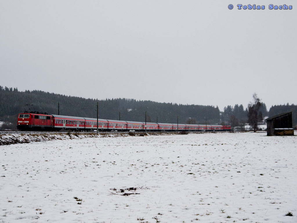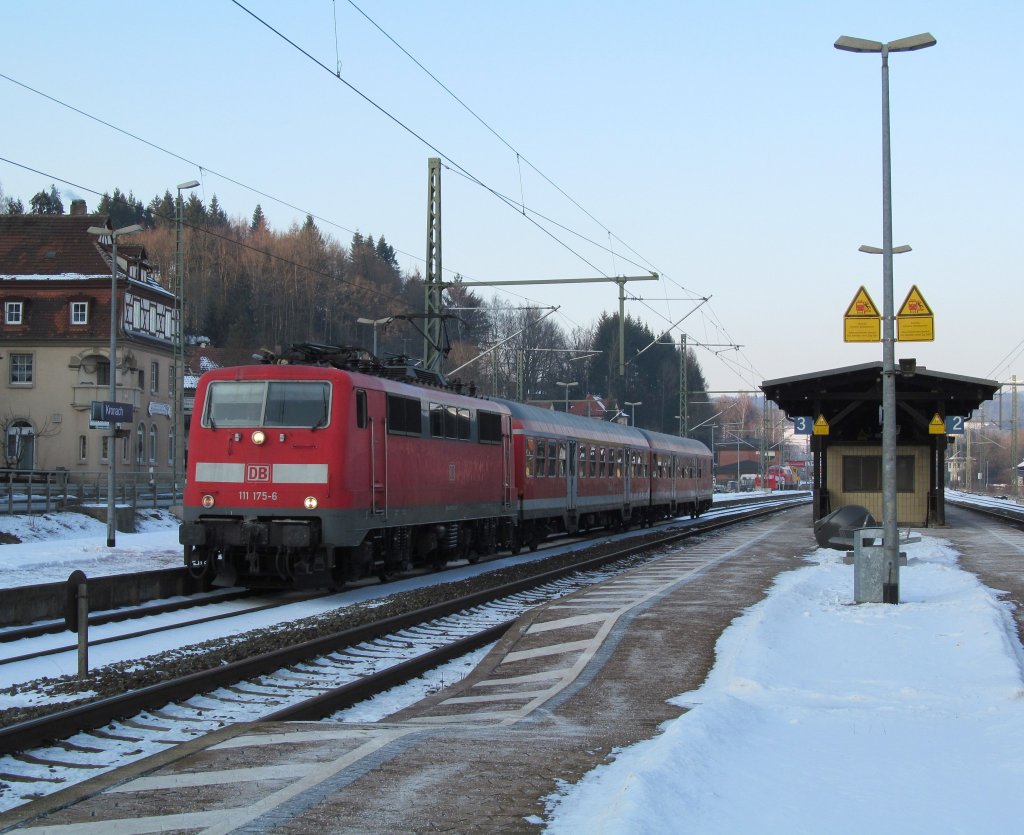 111 175-6 verlässt am 10. Februar 2012 mit einer umgekehrt gereihten Regionalbahn nach Bamberg den Kronacher Bahnhof.