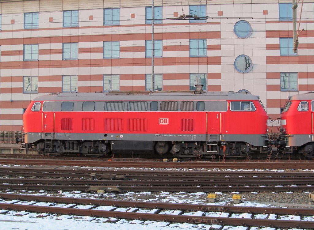218 830-8 steht am 11. Februar 2012 im Gleisvorfeld des Nürnberg Hbfs abgestellt.