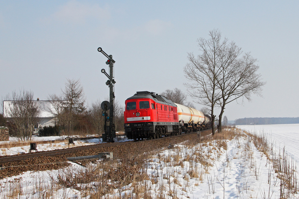 232 252 mit einem gemischten Güterzug am 10.02.2012 in Freihöls.