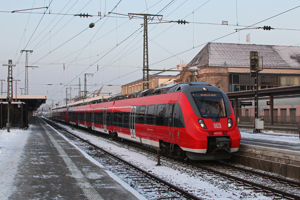 Ein abendlicher RE aus Sonneberg erreicht am 11. Februar 2012 den Nürnberger Hbf. Im Hintergrund ist noch eine RB aus München Hbf erkennbar.